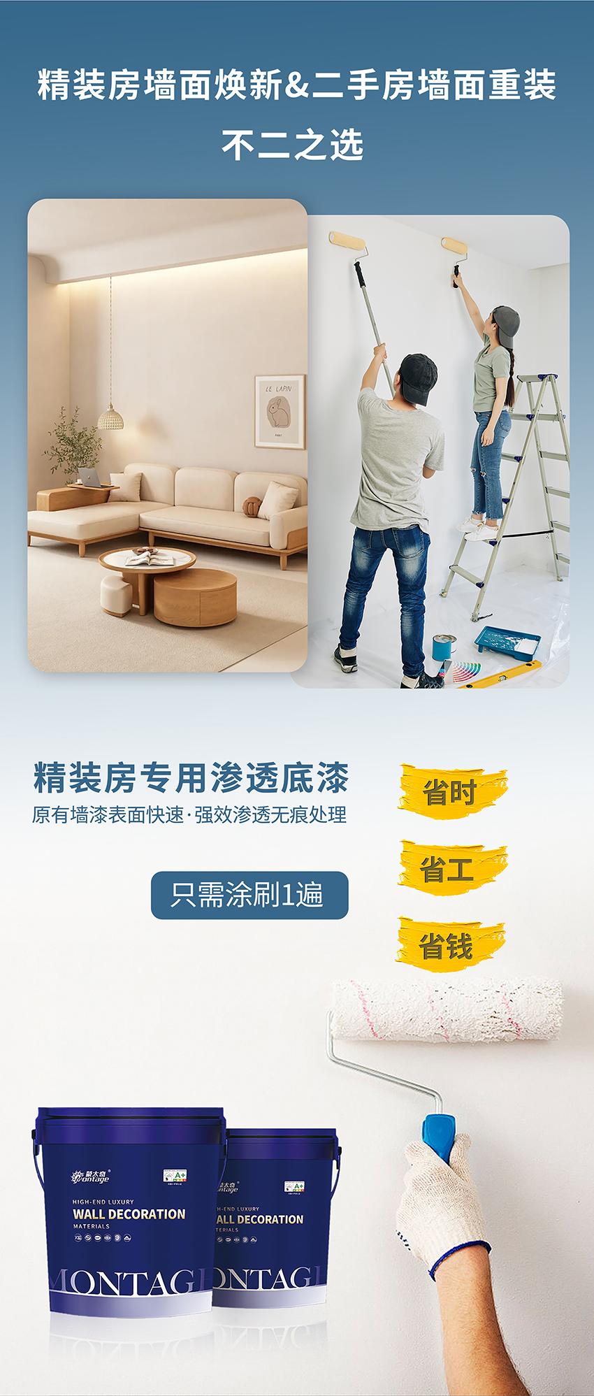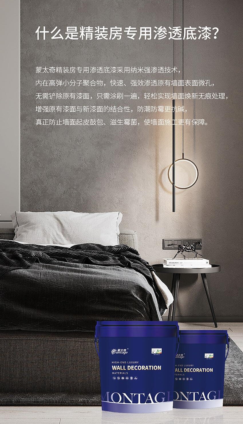 為了全方位解決精裝房或二手房客戶家裝煥新需求,針對(duì)原有乳膠漆墻面常見的起皮、裂紋、返堿等問(wèn)題隱患,蒙太奇推出新品——精裝房滲透底漆。