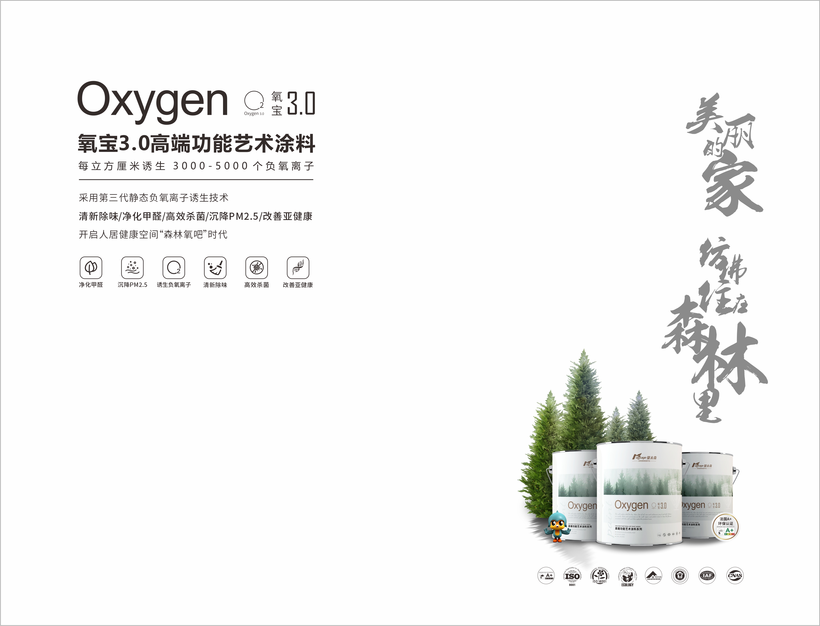 2023年5月17日全新推出氧寶3.0系列高端功能藝術(shù)涂料,開啟健康人居空間“森林氧吧”時代。氧寶3.0系列藝術(shù)涂料采用第三代靜態(tài)負氧離子誘生技術(shù),每立方厘米誘生3000-5000個負氧離子,清新除味、凈化甲醛、高效殺菌、沉降PM2.5、改善亞健康,讓您美麗的家仿佛住在森林里。CCC認證證書,不僅是對我們產(chǎn)品的認可,更是對每一位消費者的承諾,用心做好每一款產(chǎn)品,用創(chuàng)新科技守護居家健康。