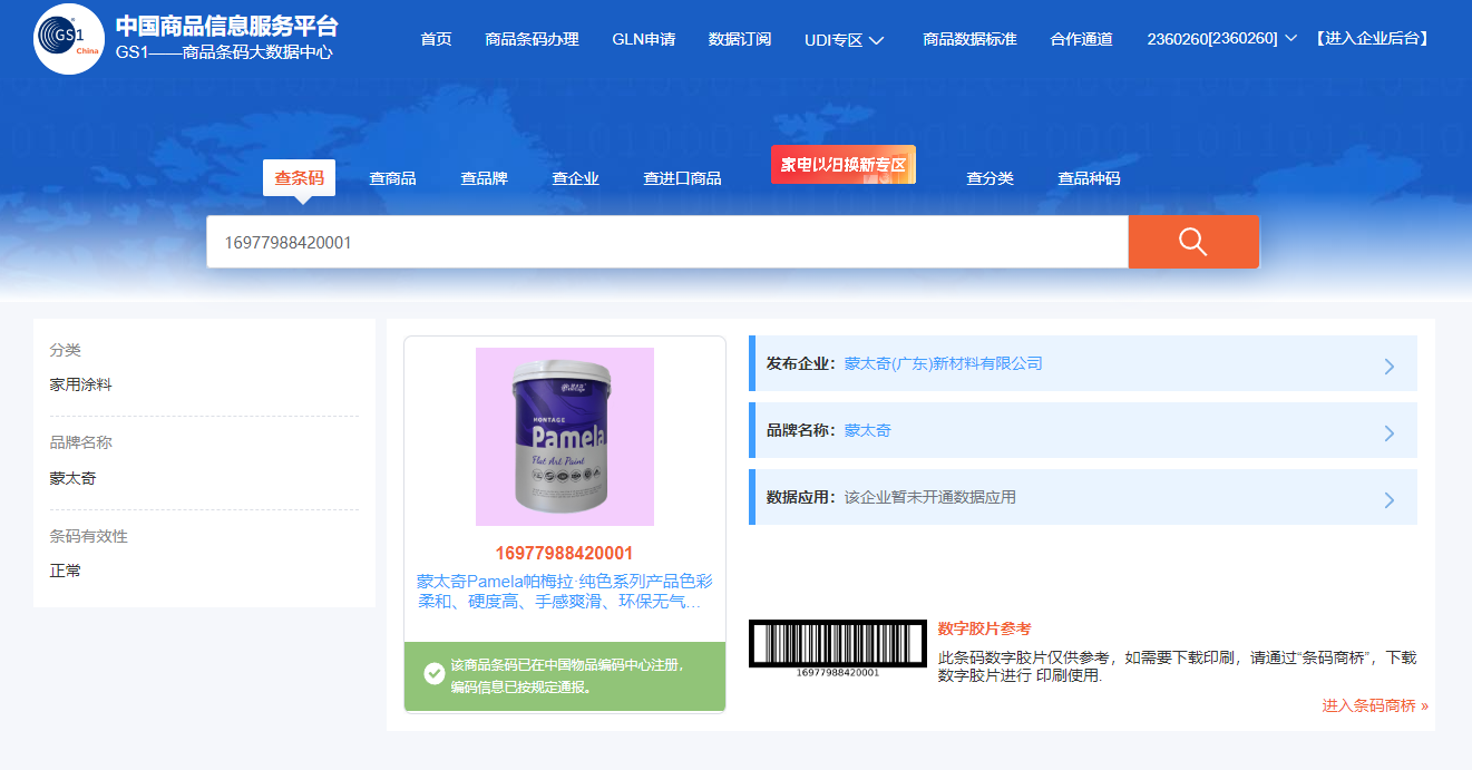 登錄中國(guó)商品信息服務(wù)平臺(tái)(https://www.gds.org.cn/#/home/index),輸入條形碼,即可進(jìn)行信息查詢(xún)。蒙太奇全系列產(chǎn)品的“加碼”工作正將逐步完善中,敬請(qǐng)期待。