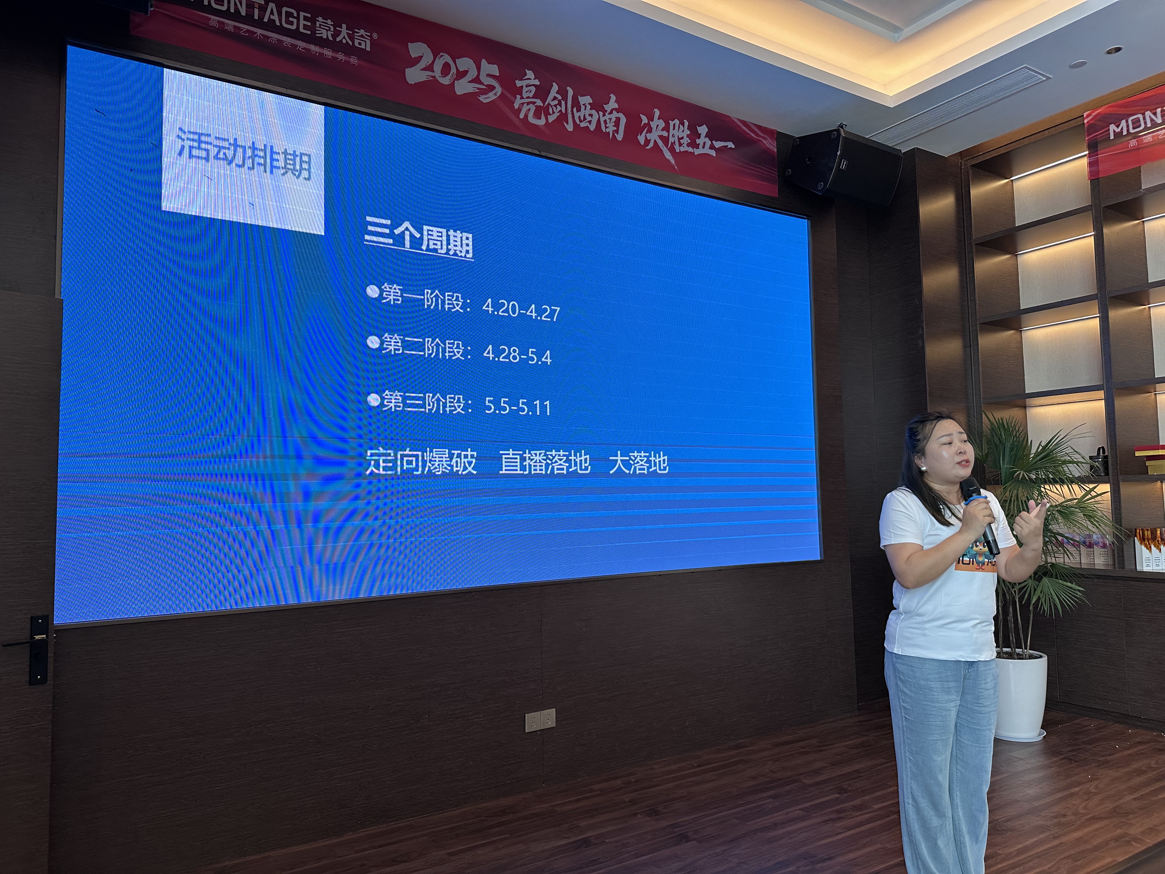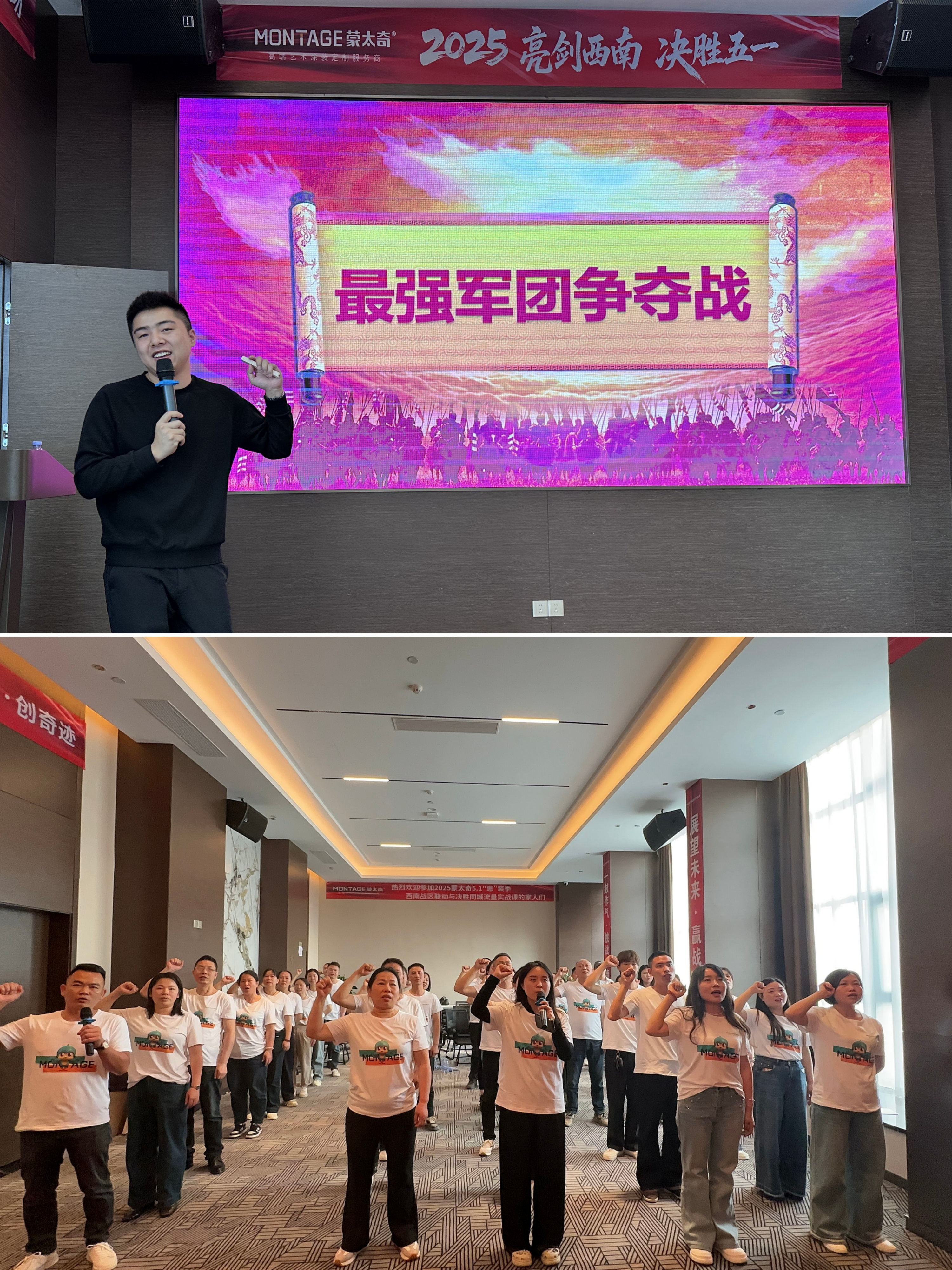 隨后,由蒙太奇主動營銷總監(jiān)黃勇詳細(xì)講解專屬動銷政策與流量扶持,并對全體經(jīng)銷商家人們進(jìn)行作戰(zhàn)培訓(xùn),深度賦能活動落地,助力西南經(jīng)銷商在五一“惠”裝季活動斬獲佳績。誓師大會上,在黃勇的引領(lǐng)下,全體經(jīng)銷商信心滿滿、斗志昂揚(yáng),踏上新的業(yè)績征程,向著勝利的目標(biāo)全速前進(jìn)。