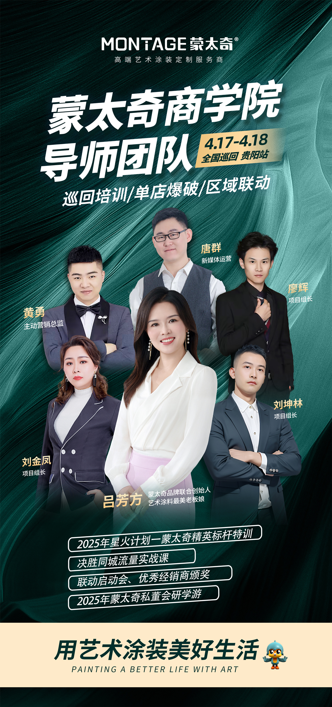 4月17日—18日的西南終端流量特訓(xùn)營,由蒙太奇聯(lián)合創(chuàng)始人、藝術(shù)涂料最美老板娘呂芳方率隊主講,圍繞爆品打造策略+高轉(zhuǎn)化營銷話術(shù)兩大核心模塊,結(jié)合蒙太奇品牌定位、新品培訓(xùn)、渠道打法,展開深度剖解,助力經(jīng)銷商強(qiáng)化品牌信念、深化產(chǎn)品認(rèn)知、精進(jìn)銷售技能,實(shí)現(xiàn)門店業(yè)績倍增。