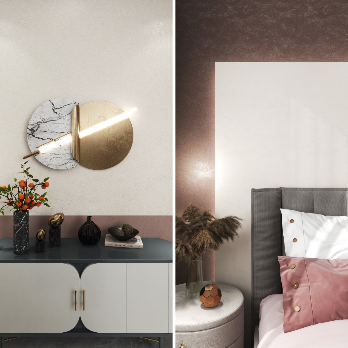 撒布洛金擦色藝術(shù)漆華麗多彩,通過特殊工藝,墻面肌理細節(jié)在柔和的光影下無盡變化,賦予墻面生動層次與無限遐想。