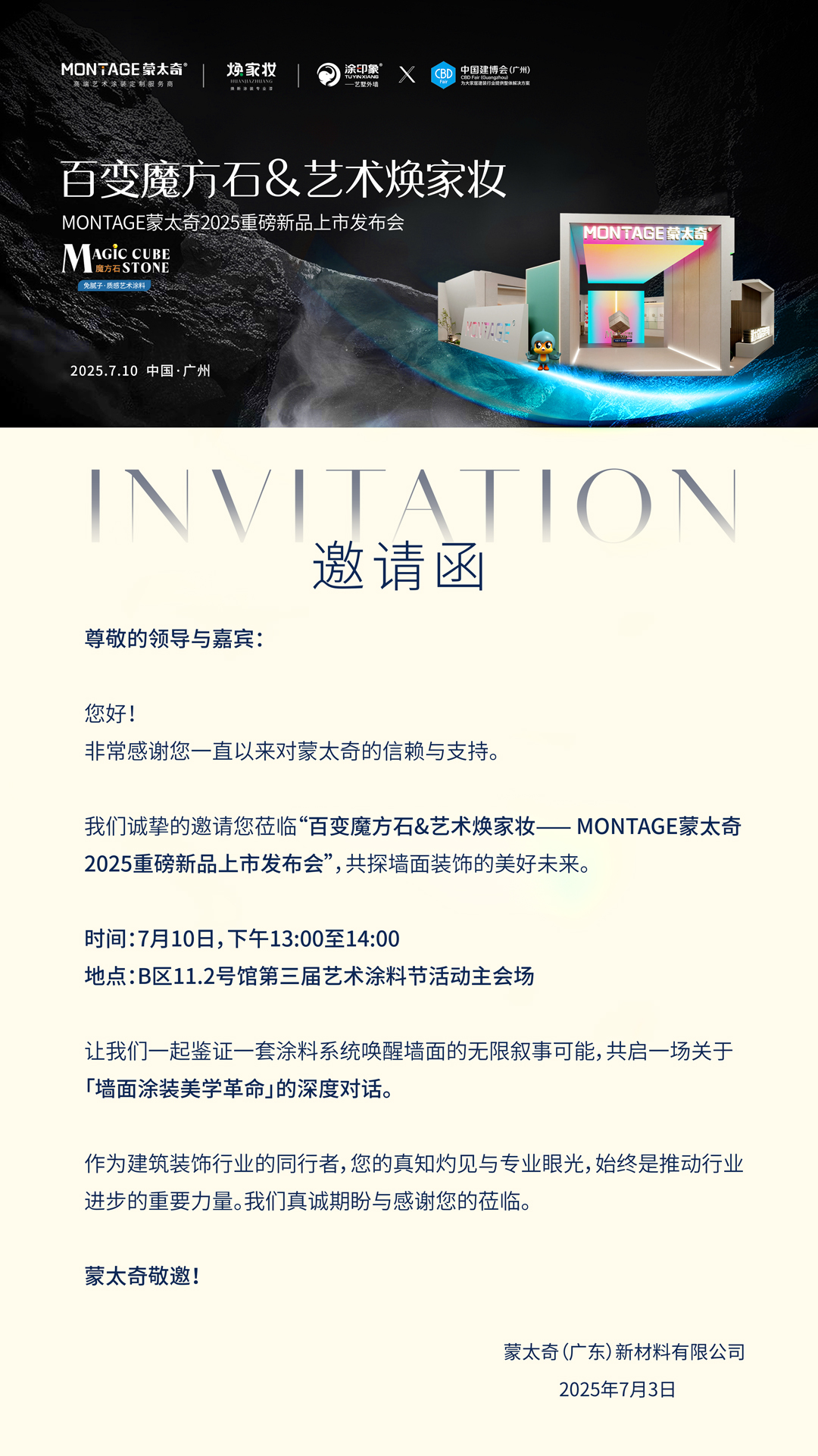 接下來的三天,蒙太奇展館將有更多精彩看點等待解鎖。值得關(guān)注的是,7月9日13:00至14:00,蒙太奇將在廣州建博會B區(qū)11.2號館第三屆藝術(shù)涂料節(jié)活動會場,舉辦以“百變魔方石·藝術(shù)煥家妝”為主題的蒙太奇2025重磅新品上市發(fā)布會”。將有行業(yè)專家、設(shè)計師以及蒙太奇的核心團隊共同參與,開啟一場關(guān)于墻面涂裝美學(xué)革命的深度對話,一同探索墻面裝飾的美好未來。我們誠摯邀請您蒞臨現(xiàn)場,見證這一重要時刻,共襄盛舉!