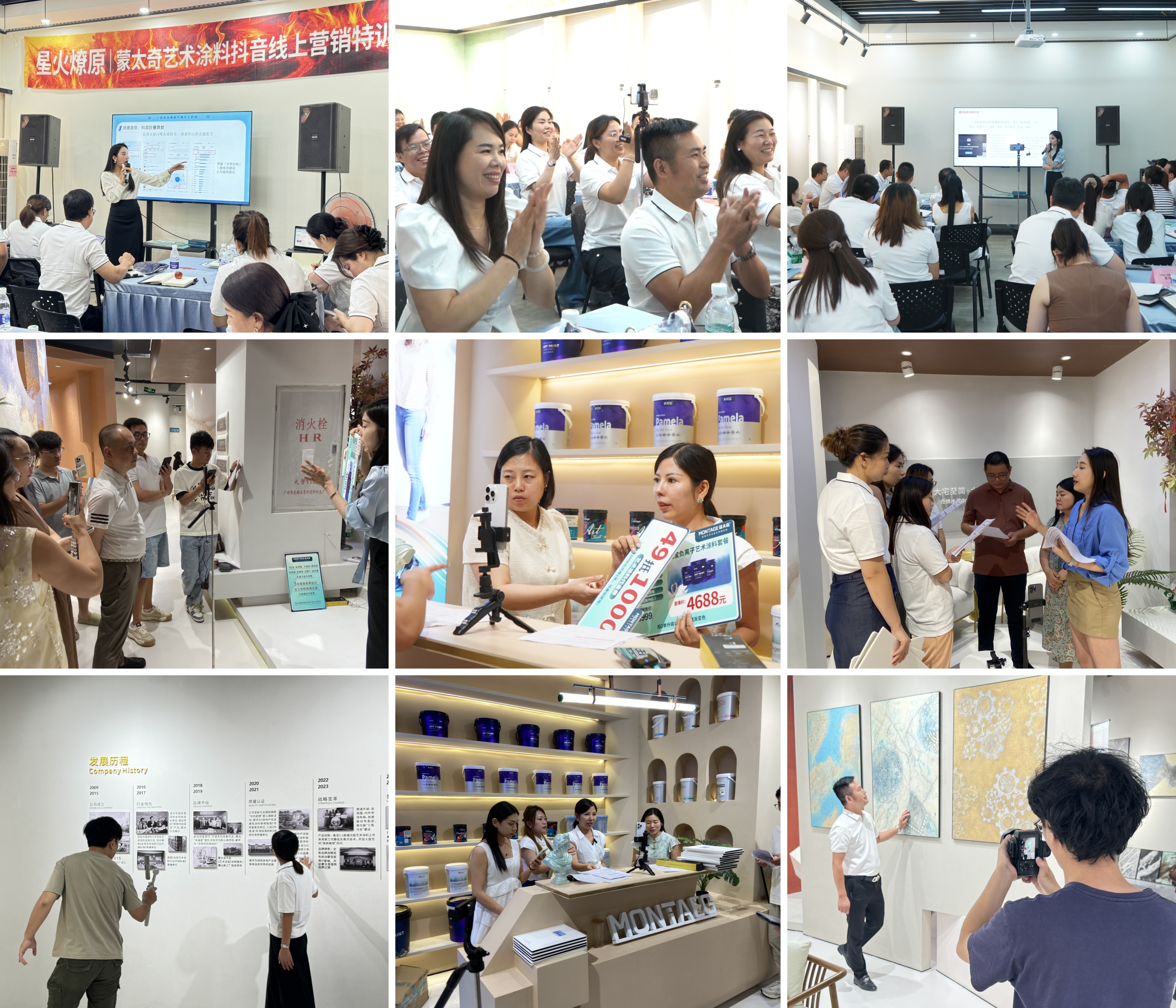另一方面離不開蒙太奇的深化終端流量賦能之路, 已成功開展多期“新媒體流量特訓(xùn)營”,蒙太奇藝術(shù)涂料總部手把手賦能終端門店掌握短視頻創(chuàng)作、直播運(yùn)營、粉絲互動等數(shù)字化營銷硬核技能。此舉有效助力單店突破地域限制,打造區(qū)域流量標(biāo)桿,讓經(jīng)銷商切實(shí)共享平臺流量紅利。