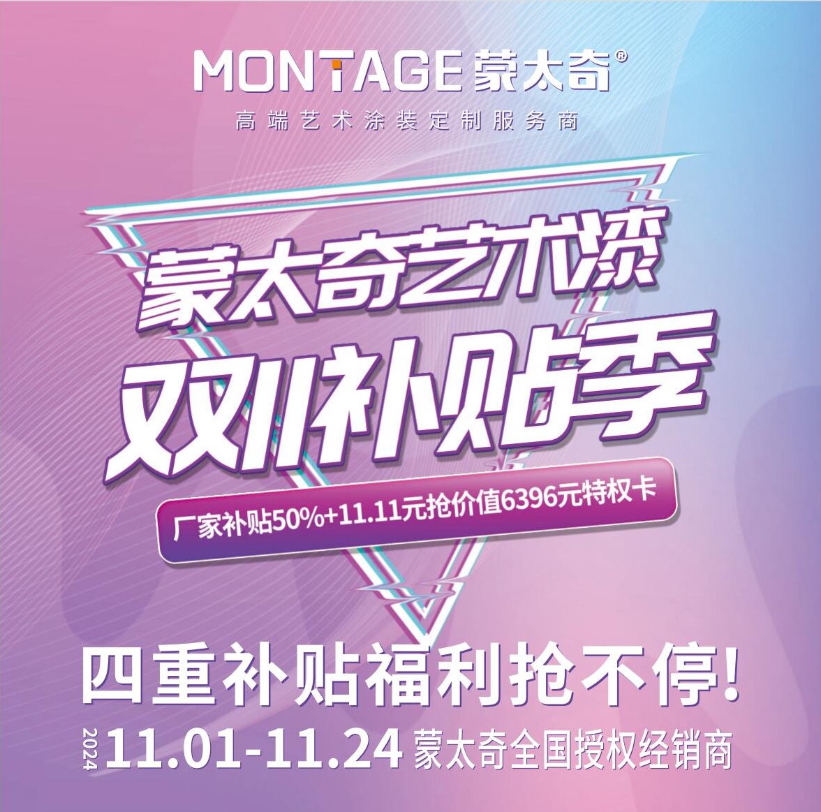 快把好消息傳開!有新房裝修或者老房改造需求的朋友有福了!蒙太奇推出雙11補(bǔ)貼季活動,不管是裝新家還是舊房煥新,都能享受廠家直接補(bǔ)貼,真正享受活動優(yōu)惠。補(bǔ)貼又逢雙11,折上再折不容錯(cuò)過!我們提供多重免費(fèi)、VIP煥新等承諾,用優(yōu)惠的價(jià)格享受高品質(zhì),雙11來蒙太奇一次省到底,幫您輕松拿下全屋藝術(shù)涂裝。
