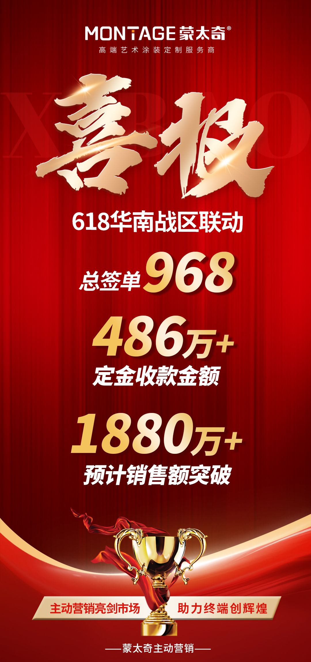 6 月 1 日至 22 日,蒙太奇 618 藝術涂料廠購節(jié)華南戰(zhàn)區(qū)聯(lián)動活動圓滿落下帷幕。活動期間,華南戰(zhàn)區(qū)各終端門店協(xié)同發(fā)力,累計成交968單,定金收款總額突破486萬元,以強勁的市場表現(xiàn)為這個火熱的 618活動 畫上了圓滿的句號,充分印證了總部戰(zhàn)略賦能與終端高效執(zhí)行協(xié)同體系的強大力量。